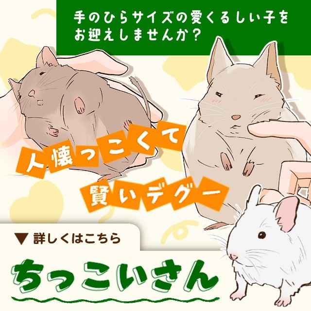 のブリーダーとして自家繁殖を行い、新しいご家族様へとお引き渡ししています。初めて飼育される方でも安心してデグーを迎えいれられるよう必要な物や、エサ、飼育方法をご説明いたしますので、まずはお気軽にお問い合わせください!